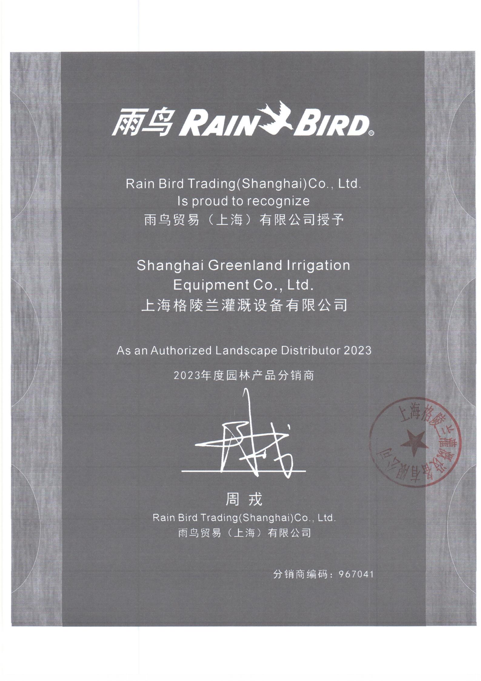 2019美國雨鳥分銷商證書